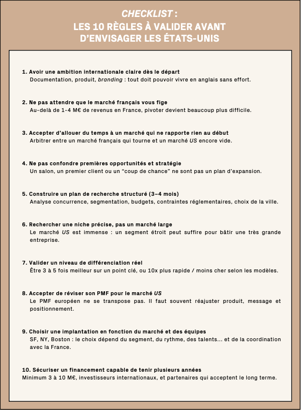 ” This playbook is not a promise of success. It is a lucidity guide. The objective is not to push everyone to go US. The objective is to allow those who go there to do it at the right time, for the right reasons, with a preparation worthy of the level of risk, and therefore the level of ambition. ”